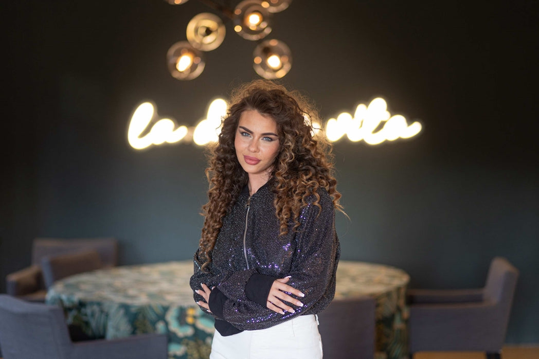 Discover our must-have Amina summer jacket. This garment is designed to be worn rather loose, offering a casual style. Dressed with mini sequins, this jacket will brighten up your day. Worn by a 168 cm model, who wore a size S, her usual size is S.